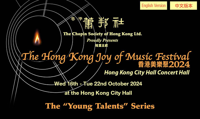 The Chopin Society would like to offer our audiences the opportunity to listen to some of those promising, budding young artists by presenting them in brief recitals at the start of each night’s main performance. Their appearance is not there to offer opportunity for comparison or criticism, nor in any way, is their presence to detract from what follows after their brief appearance, that is the performances of seasoned and mature artists. But their presence on stage is a salute to these young talents and it is the Society’s way of giving them the chance to share, briefly, the limelight with the older and more experienced colleagues. It also gives the Hong Kong audience a sample of the artists whom they will be enjoying in the near future.