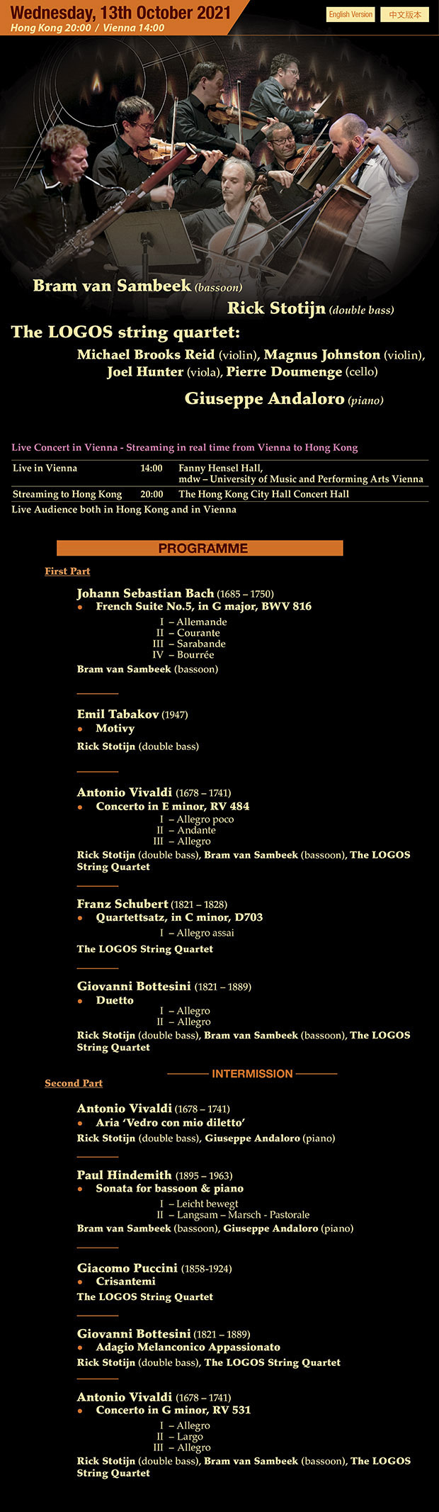 The University of Music and Performing Arts – Vienna streamed live either Vienna or Hong Kong Hong Kong City Hall Concert Hall – Hong Kong The Future Lab Concert Hall The Fanny Hensel Hall Alvaro Pierri, Honggi Kim, Giuseppe Andaloro, Ilya Rashkovskiy, Luka Okros, Jinang Lee Anastasia Kobekina, The Simply Quartet Colleen Lee, Rachel Cheung, Ling Wang, Maestro YVES ABEL, Emanuil Ivanov THE HONG KONG PHILHARMONIC ORCHESTRA CAMILLE SAINT- SAËNS Streaming Live Music