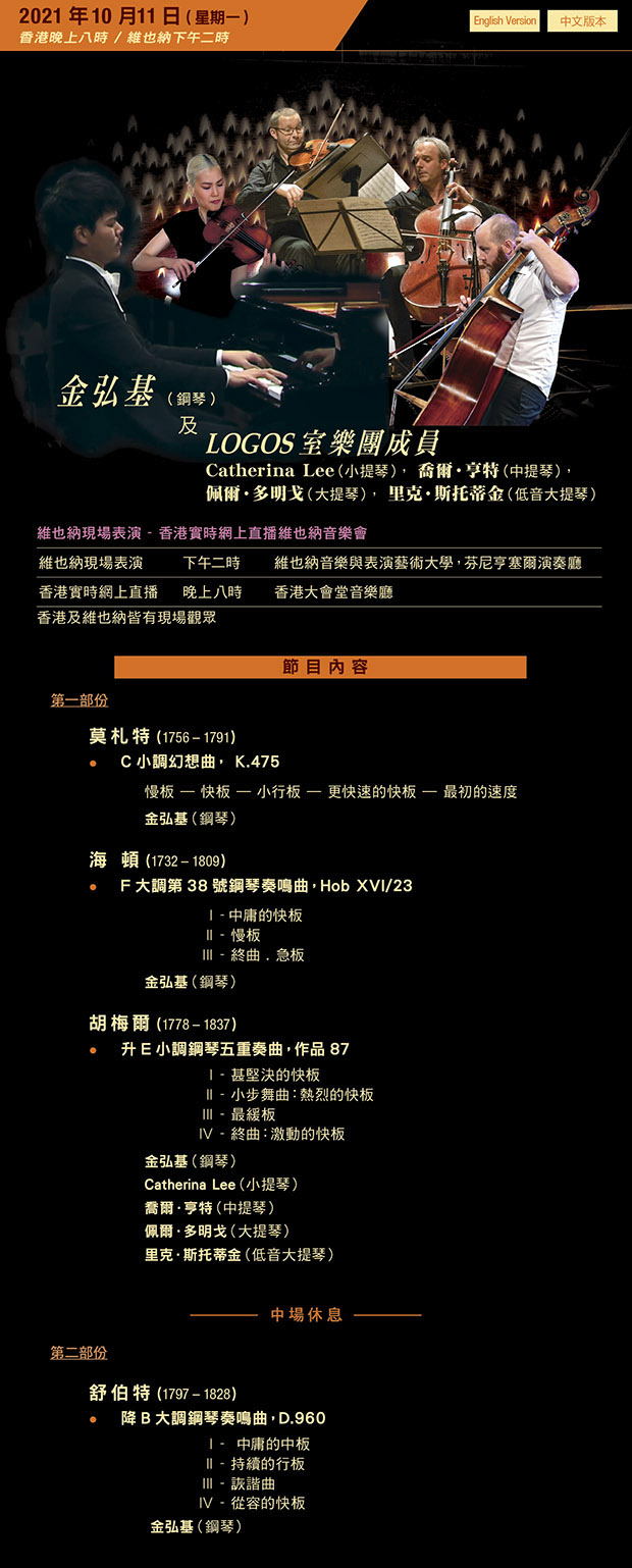 The University of Music and Performing Arts – Vienna streamed live either Vienna or Hong Kong Hong Kong City Hall Concert Hall – Hong Kong The Future Lab Concert Hall The Fanny Hensel Hall Alvaro Pierri, Honggi Kim, Giuseppe Andaloro, Ilya Rashkovskiy, Luka Okros, Jinang Lee Anastasia Kobekina, The Simply Quartet Colleen Lee, Rachel Cheung, Ling Wang, Maestro YVES ABEL, Emanuil Ivanov THE HONG KONG PHILHARMONIC ORCHESTRA CAMILLE SAINT- SAËNS Streaming Live Music