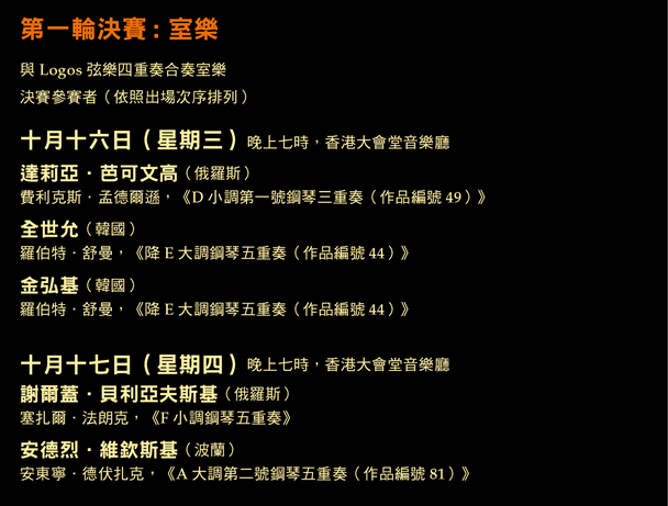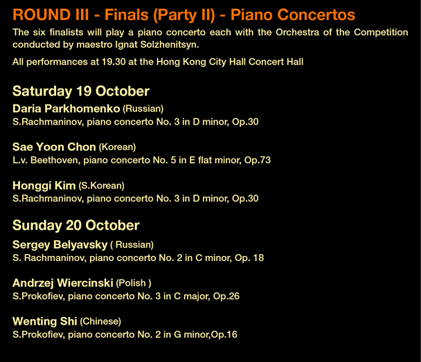 | The Chopin Society has as its key priority not only to deliver fully to Hong Kong all the programed events, but also to do so in an enjoyable and stress-free environment for the audience, the candidates and the musicians. Given the likelihood of traffic and public transport interruption on the afternoon of Sunday 20th October, the Finals Part II, three piano concertos scheduled for 19.30 on that day will be moved to |